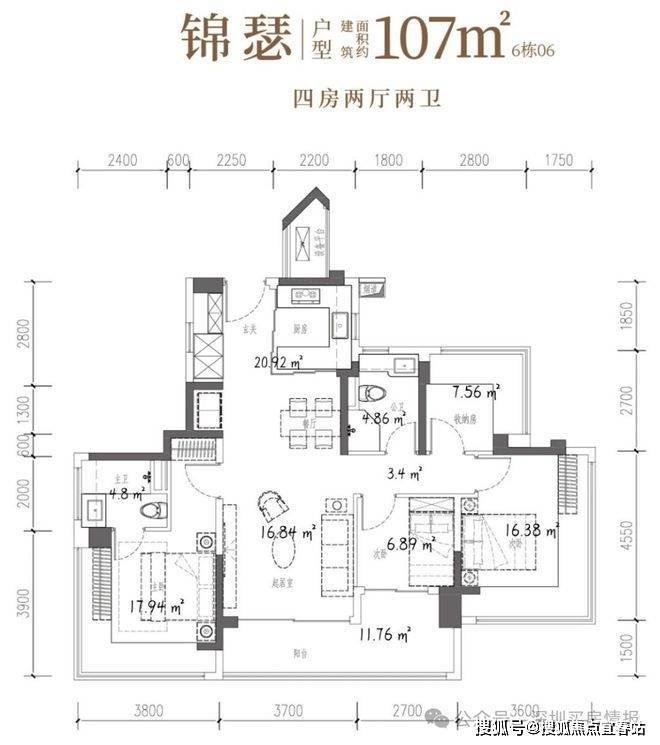 107㎡的4房2厅2卫,设计的是竖厅双龙抱珠格局,客厅3.7米开间,LDKB一体化设计,预留冰箱卡槽位,四开间朝南,主卧+2个次卧270°无柱转角飘窗,分别做到了主卧17.94㎡/次卧16.38㎡/次卧7.56㎡/次卧6.89㎡(包含墙体飘窗),U型厨房烟道外置,卫生间干湿分离,得房率约104.06%(包含赠送),客厅连接次卧出超大阳台约11.76平,东北朝向。