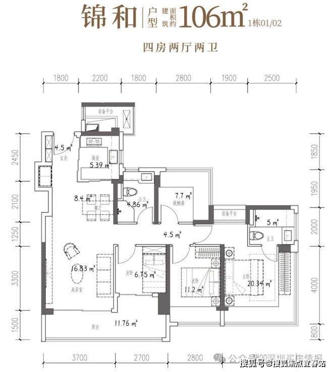 106㎡的4房2厅2卫,设计的是竖厅格局,客厅3.7米开间,LDKB一体化,S墙设计预留冰箱卡槽位,四开间朝南,动静分区,主卧270°无柱转角飘窗还带1个设备平台约1.52平,分别做到了主卧20.34㎡/次卧11.2㎡/次卧7.7㎡/次卧6.75㎡(包含墙体飘窗),U型厨房烟道外置,卫生间干湿分离,得房率约101.16%(包含赠送),客厅连接次卧出大阳台11.76平,东南朝向