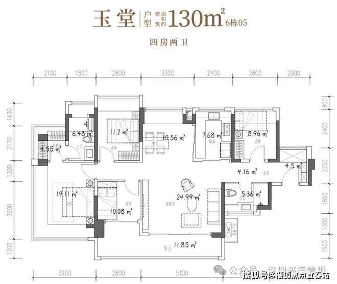 130㎡的4房2厅2卫,设计的是竖厅南北通透格局,进门独立玄关,客厅5.1米开间,客餐厅分离化设计,主卧270°无柱转角飘窗+衣帽间,分别做到了主卧23.66㎡/次卧11.2㎡/次卧8.96㎡/次卧7.84㎡(包含墙体飘窗),U型厨房烟道外置,卫生间干湿分离,得房率约101.95%(包含赠送),客厅连接次卧出超大阳台约14.09平,东北朝向。
