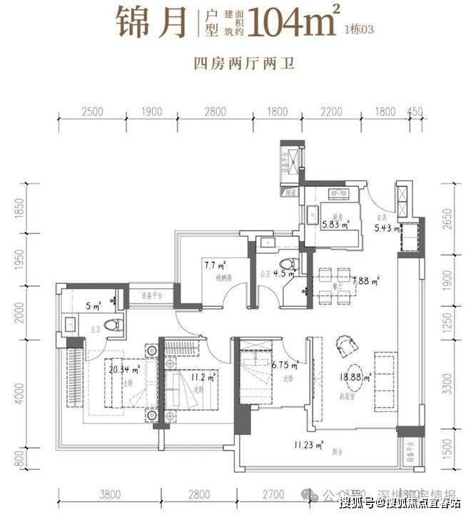 104㎡的4房2厅2卫,设计的是竖厅格局,客厅4.15米开间,LDKB一体化设计,预留冰箱卡槽位,四开间朝南,动静分区,主卧270°无柱转角飘窗还带1个设备平台约1.52平,分别做到了主卧20.34㎡/次卧11.2㎡/次卧7.7㎡/次卧6.75㎡(包含墙体飘窗),U型厨房烟道外置,卫生间干湿分离,得房率约100.71%(包含赠送),客厅连接次卧出大阳台约11.23平,西南朝向。