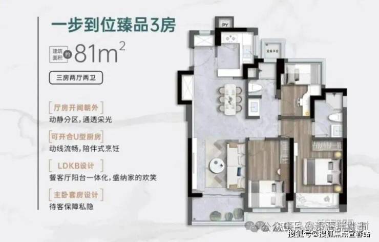 81㎡的3房2厅2卫,设计的是竖厅格局,客厅3.05米开间,LDKB一体化,S墙设计预留冰箱卡槽位,动静分区,U型厨房,卫生间三段式干湿分离还带1个设备平台,得房率约91%(包含赠送),实用面积约73.71m²,正东或正南朝向。