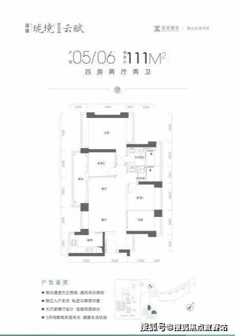 111㎡四房两厅两卫:横厅南北通透,五开间朝南,客厅连接次卧出6.15米大阳台,U型厨房,卫生间干湿分离,得房率约75.4%,阳台主朝东南或西南向,部分户型可看阳台山景。