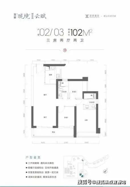 102㎡三房两厅两卫:经典竖厅格局,三开间朝南,客厅连接次卧出6.4米大阳台,U型厨房,卫生间干湿分离,得房率约75.41%,适合改善型家庭。