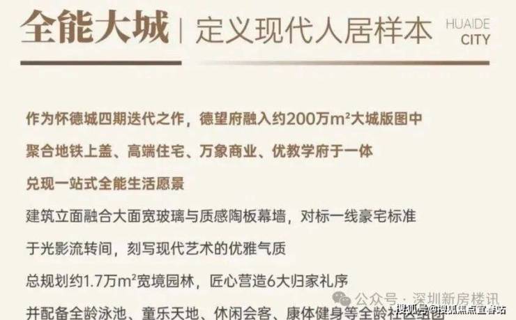 怀德城·德望府,作为深圳西部重要的TOD城市综合体项目,位于宝安区福永街道怀德社区,是怀德旧村城市更新项目的第四期作品。项目紧邻地铁12号线怀德站,由深圳市怀德房地产开发有限公司开发建设,作为大前海、大空港、大会展、海洋新城四大战略区域的交汇点,德望府不仅区位价值突出,更以完善的配套设施和人性化设计,打造了一站式全能生活大城。