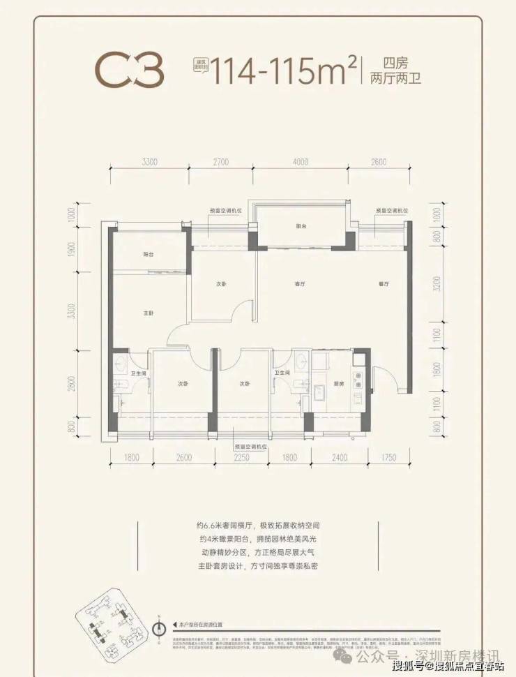 114-115㎡的4房2厅2卫,C3户型,设计的是横厅南北通透格局,客餐厅6.6米开间,LDKB一体化设计,五开间朝南,全屋7面飘窗,分别做到了主卧17.16㎡/次卧10.8㎡/次卧9.36㎡/次卧8.1㎡(包含墙体飘窗),U型厨房,卫生间干湿分离,得房率约78.9%(包含赠送),阳台约7.2㎡主朝东北或西南向。套内面积89.73㎡+赠送面积19.65㎡=实得面积109.38㎡,加上赠送后得房率约96.17㎡。