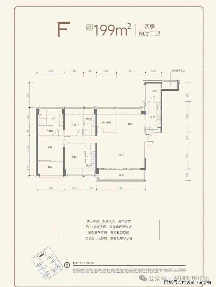 199㎡的4房2厅2卫,F户型,设计的是横厅南北通透格局,客厅7.3米开间大方厅,餐客厅分离化设计,四开间朝南,动静分区,分别做到了主卧23.6㎡/次卧16.89㎡/次卧12.18㎡/次卧11.7㎡(包含墙体飘窗),L型厨房带1个生活阳台,卫生间干湿分离,得房率约79%(不含赠送),长7.3米的大阳台约12.77㎡东南朝向。套内面积157.61㎡+赠送面积28.65㎡=实得面积186.26㎡,加上赠送后得房率约93.41㎡。