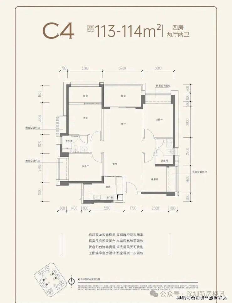 113-114㎡的4房2厅2卫,C4户型,设计的是竖厅双龙抱珠格局,客厅3.7米开间,LDKB一体化设计,分别做到了主卧15.18㎡/次卧12.6㎡/次卧10.8㎡/次卧9.58㎡(包含墙体飘窗),U型厨房,卫生间干湿分离,得房率约78.9%(不含赠送),阳台约7.77㎡东北或西南向。套内面积89.43㎡+赠送面积13.16㎡=实得面积102.6㎡,加上赠送后得房率约90.52㎡。