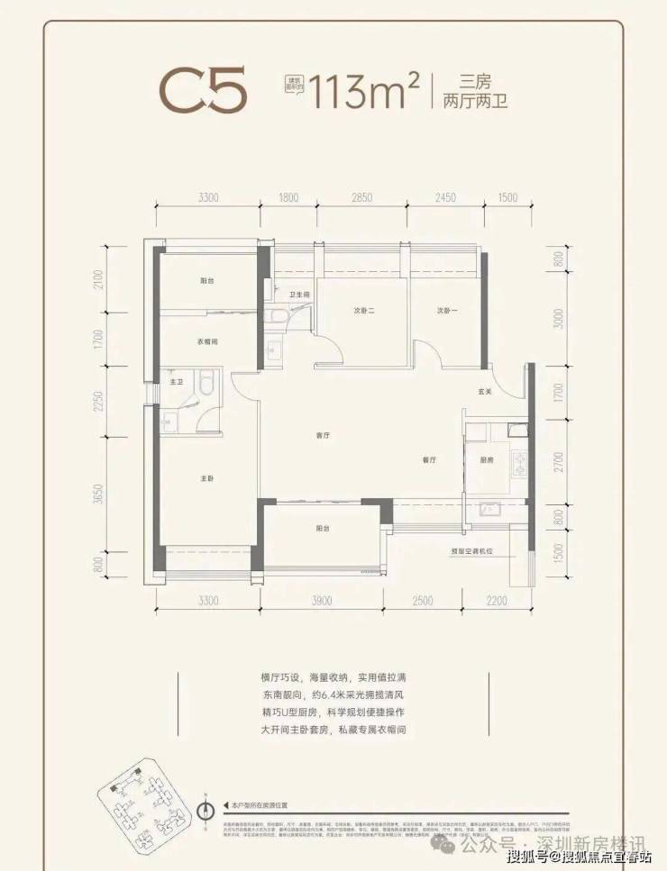 113㎡的4房2厅2卫,C5户型,设计的是横厅南北通透格局,客餐厅6.4米开间,LDKB一体化设计,四开间朝南,全屋6面飘窗,分别做到了主卧15.93㎡/次卧12.54㎡/次卧10.83㎡/次卧9.31㎡(包含墙体飘窗),U型厨房,公卫三段式干湿分离,得房率约79%(不含赠送),阳台约8.97㎡东南朝向。套内面积89.66㎡+赠送面积20.03㎡=实得面积109.69㎡,加上赠送后得房率约96.7㎡。