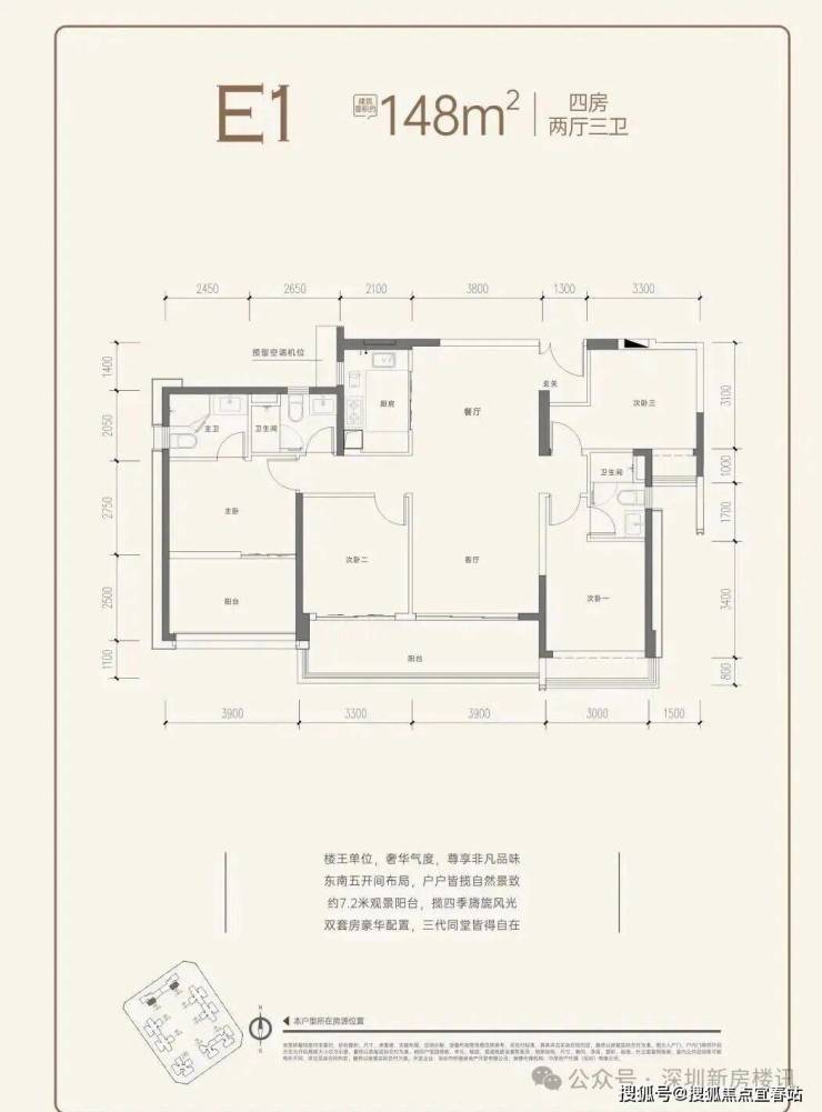 148的4房2厅3卫,E1户型,设计的是竖厅类双龙抱珠格局,客厅3.9米开间,LDKB一体化设计,四开间朝南,双套房设计,分别做到了主卧20.47㎡/次卧13.6㎡/次卧11.53㎡/次卧11.38㎡(包含墙体飘窗),U型厨房,公卫三段式干湿分离,得房率约79%(不含赠送),客厅连接次卧出7.2米长的大阳台约13.68㎡东南朝向。套内面积117.03㎡+赠送面积17.89㎡=实得面积134.92㎡,加上赠送后得房率约91.12㎡。