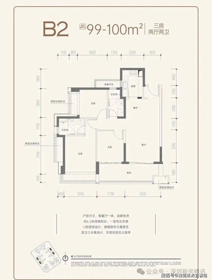 99-100㎡的3房2厅2卫,B2户型,设计的是经典竖厅格局,客厅3.5米开间,LDKB一体化设计,动静分区,分别做到了主卧16.31㎡/次卧10.36㎡/次卧8.64㎡(包含墙体飘窗),U型厨房,卫生间干湿分离还带1个设备平台,得房率约78.9%(不含赠送),客厅连接次卧出6.2米长的大阳台约11.78㎡,东北或西南朝向。套内面积78.01㎡+赠送面积13.01㎡=实得面积91.02㎡,加上赠送后得房率约92.06㎡。