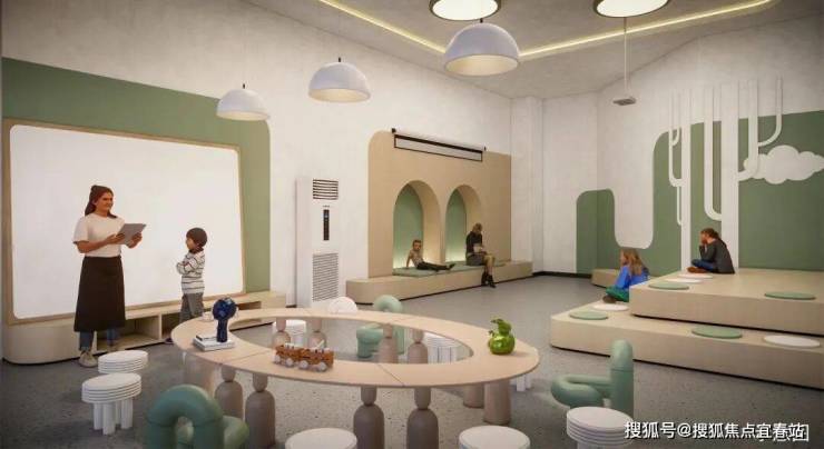 考虑到孩子天性好动,在安全上提前做好了应对,例如在儿童活动主要区域内做了防磕碰倒角或软包处理,易跌落地面则采用EPDM(缓冲)地面,避免孩子磕碰受伤。