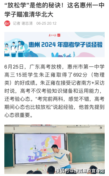 6月25日,2024年广东高考成绩公布,惠州一中多名学子取得高分,剑指清北。惠州一中学子朱正雍692分,目标瞄准清华北大;学子林子超总分689,物理满分,清华北大已约面谈!学子熊扬轶作为奥赛国家队集训学生,被保送清华大学……要想高考考的好,小学初中很重要!惠州一中仲恺校区(公立小学初中),9年一中优教护航,给孩子圆梦清北的理想起点。