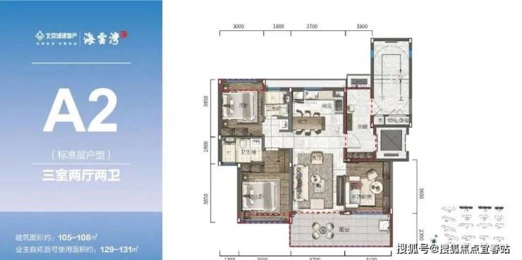 标准洋房产品(A1、A2):105-117㎡演绎大面宽短进深的经典格局 三室两厅悦享方正宜居,品鉴自贸港粹美生活