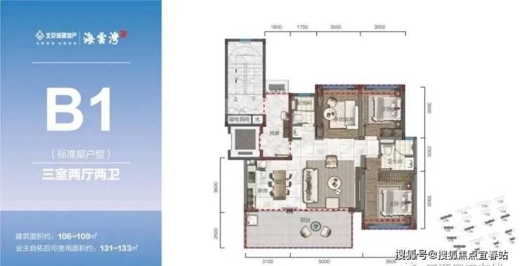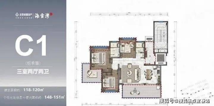 标准洋房产品(B1、C1):主力107-120㎡超大横厅宽境墅质洋房 三室两厅奢适尺度阔景阳台,纵览一线海岸