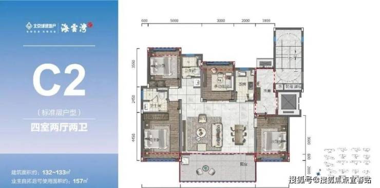 标准洋房产品(C2):132㎡宽境横厅优雅有序向海而生 四室两厅放纵阔悦人生,承袭生活缤纷礼仪