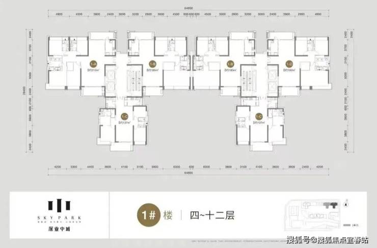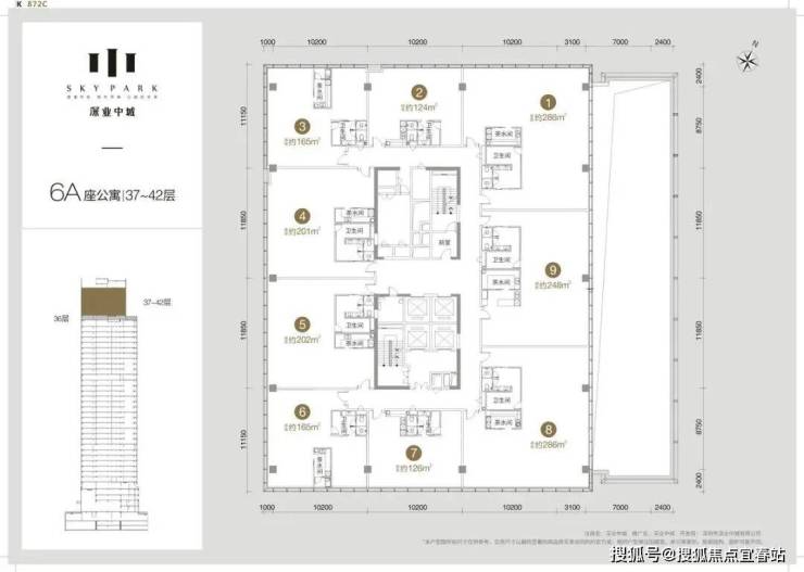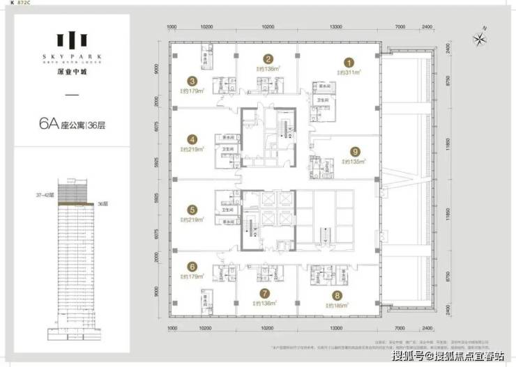 其中6A栋为6-35层为办公,37-42层为公寓;6B栋6-9层为酒店,10-42层为公寓。1栋:产品是面积段为137-185-192㎡的3房、212㎡的4房、以及4套300㎡以上的顶层复式单位,其中36层及以下为2梯3户“品”字形结构,37层及以上为2梯2户的板楼结构;