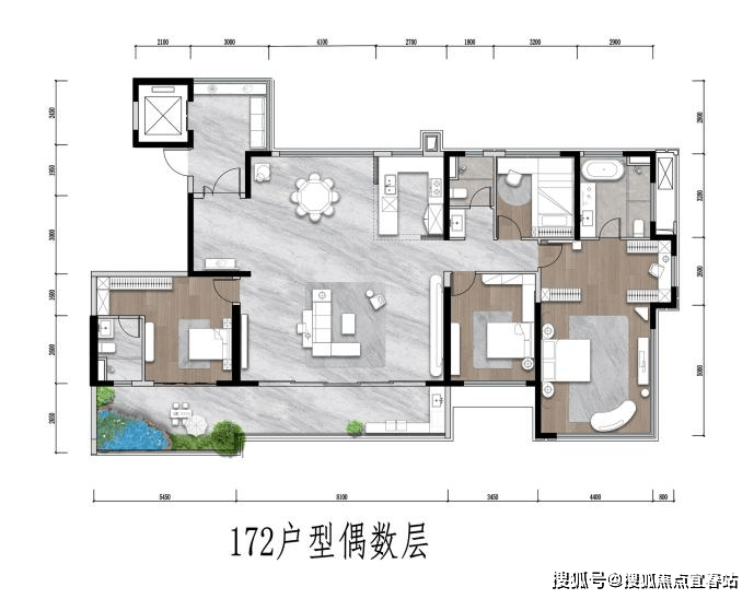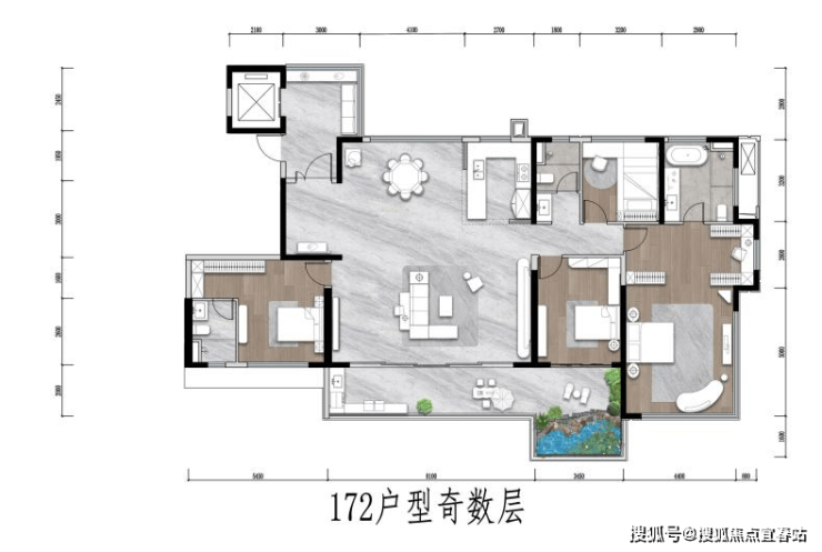 172㎡户型在此基础上进一步提升,配有独立玄关空间;8m面宽巨幕客厅,可改造为五房户型。