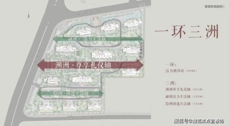 整体景观以"洲岛、宋韵"为魂,通过"一环三洲"架构,五进十园呈现,打造具有岭南基因的现代住区。詹园礼序、中山在地文化与空间结合,以特色植物营造四季画卷,实现具有地域特色的悦系理想人居。