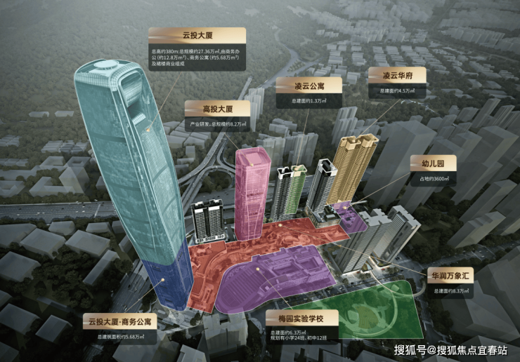 综合体具体包含高端商务写字楼(云投大厦)、研发办公楼(高投大厦研发办公楼)、商务公寓、云端住宅(凌云华府)、华润万象汇商业、配建幼儿园,以及坐拥家门口九年制学校。