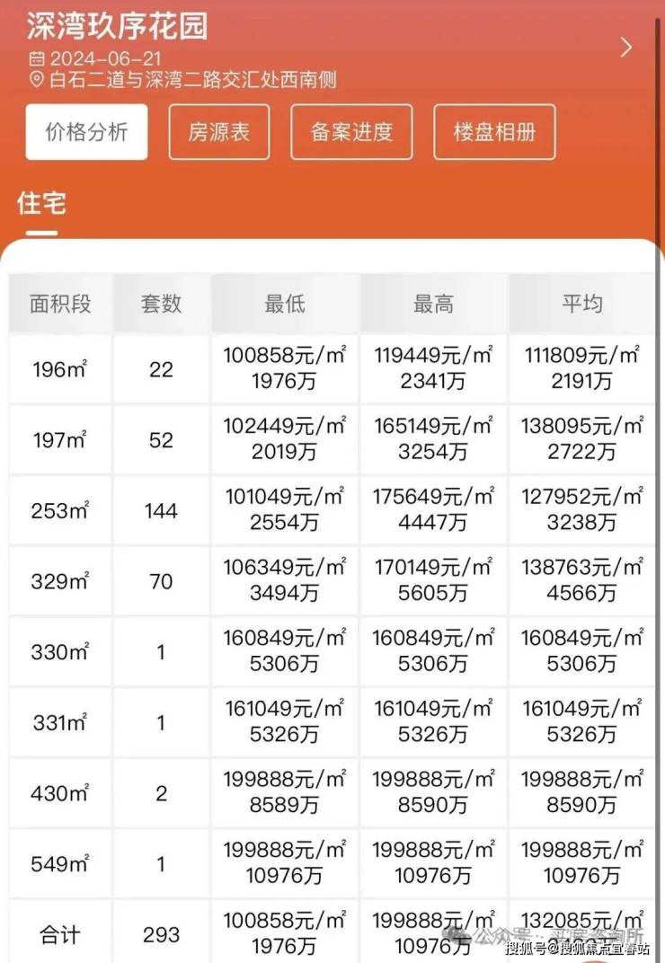 中海深超总在去年6月21号拿证共备案293套197-252-328㎡,其中还有3套顶楼复式429-549㎡,项目备案最低单价是2B座的197㎡10.08万,总价1976万起,最高备案单价分别是2栋A座01户型549㎡,2栋B座01以及2栋C座01的429㎡三个户型均为19.98万,其中549㎡总价1.09亿,429㎡总价8589-8590万这三个户型为顶层复式,除了3套顶层复式毛坯交付,其他户型都要在备案价基础还得加近1万/㎡的装修费用,其中按最低备案单价10.08万,最低备案总价1976万➕最低装修标准加9500/㎡的话等于最低单价11万/㎡,最低总价2161.8万起