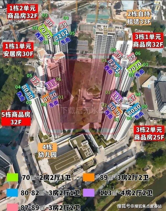 东地块有6栋住宅,1栋1单元安居房30F,1栋2单元商品房32F,2栋企业自持租赁住房32F,3栋1单元商品房32F,3栋2单元商品房25F,4栋是1所12班制幼儿园。