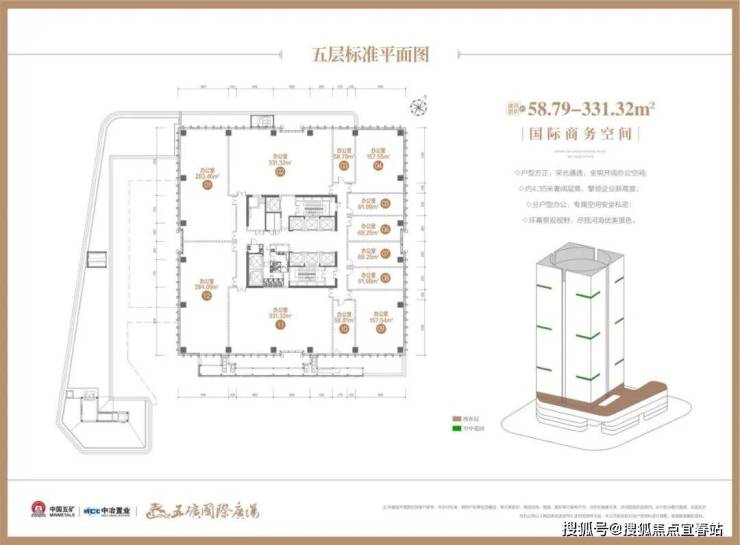 【楼栋概况】楼体高度110米,地下二层地上22层,1-4层为城市中芯底商,首层层高约6米、2层层高约为4.5米、3/4层层高约为4.35米;5至18层为国际商务空间,层高约为4.2米。
