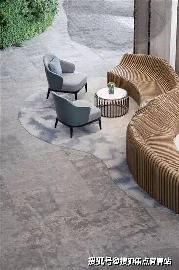 地毯延续灰色地面,与主色调呼应,既不显得突兀又在视觉上让空间得以延伸,略微弯曲的形状恰好与座椅的形态形成一致,连续性的木质波浪座椅如涌动的波浪,引人遐想之余也呼应了整体的基调。