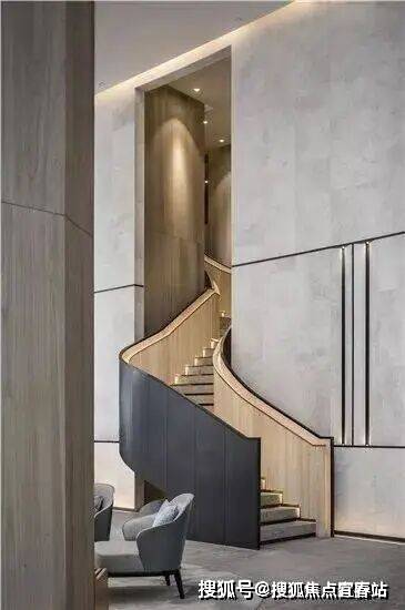 富有雕塑感的楼梯外观被漆成暗黑色,与原木色的相搭,更显的灵动却又不失优雅,阶梯间微微透出的黄色灯带,让人置于其中愈显温暖。也从细微之处看到设计师探索自然、融于艺术的初衷所在。除此之外,大面积绿植被置于空间当中,立足于长远的生态性原则且有氧低碳生活的理念引导。