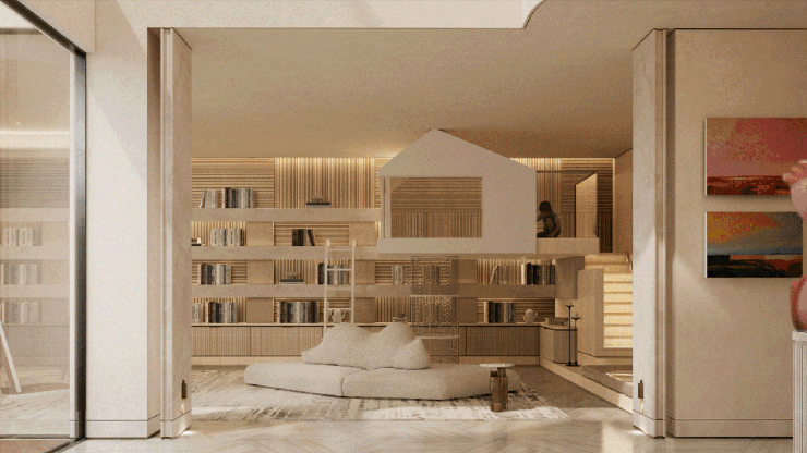 通过星空露台、入户前庭、地下藏馆,构建起一个功能完整的垂直生活聚场——孩子的攀岩墙、妻子的包包收藏馆、先生的私人会所,所有生活想象皆可在此落地生根。