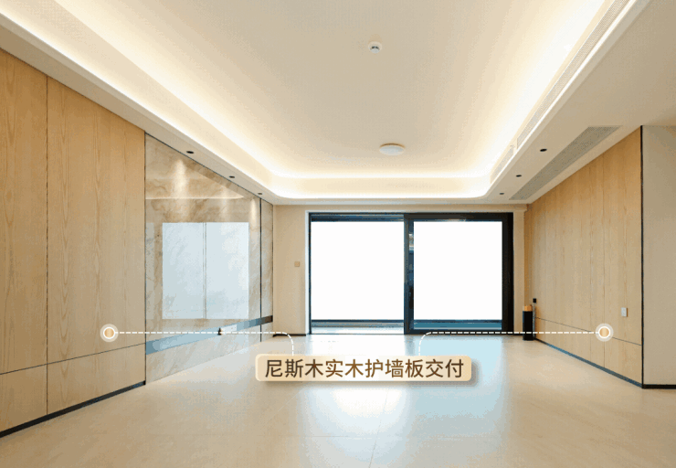 护墙板是尼斯木实木的,天然木纹清晰可见;主卧床头铺满质感墙布,触感和品位并存。