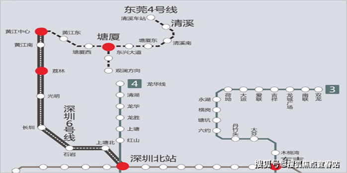 【地铁】轻轨R4线在清溪镇内设3个站点,在彭程路路口设清溪南站,在聚富新村北侧设清溪站,在清溪汽车站南侧设清溪汽车站,整体途经黄江、塘厦和清溪3个镇区。全长25.2公里,全线均为地上线,计划设站8至12个(暂定设站9个)。除了在黄江中心站与1号线换乘外,亦计划与广深市郊铁路换乘。4号线是东莞市远期建设线网,建设时序控制在2025年左右。塘厦中心站将与深圳4号线观澜站对接,实现莞深轨道融合。通车后,与深圳观澜站对接,实现深圳半小时生活半径、商务半径。