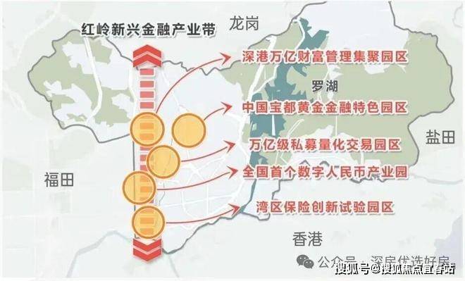 大湾区金融极:其中红岭新兴金融产业带作为"深圳三大金融增长极”之一,与前海国际金融城、福田香蜜湖金融街并列,罗湖将先天的金融优势及政府的政策支持,以金融产业赋能罗湖新发展,助力深圳成为大湾区经济发展引擎。