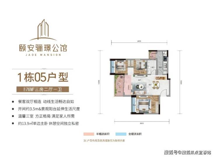 在颐安骊璟公馆,最小户型建筑面积约76㎡就能做到三房,是石岐总部为数不多的小面积三房,方正灵动,实用率高。