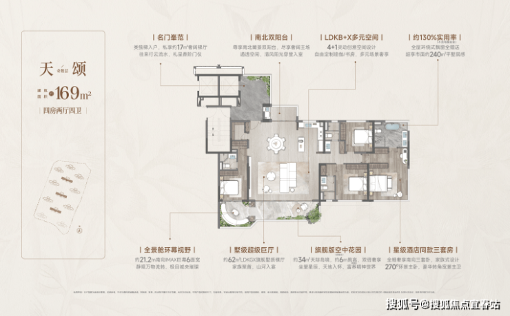 全总统套房配置:建面约169㎡天颂户型,专享3套间奢适配置,主卧套房可媲美五星酒店套房设计,奢逸生活触手可及。
