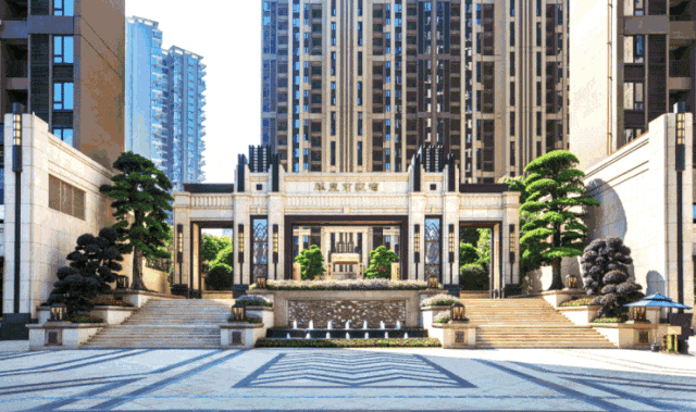 项目本身打造很奢华,深褐色与淡黄色真石材外立面,价值不菲的罗汉松主题园林,对称式皇家园林布局,十分古典大气有排面,颜值颇高不落俗套。
