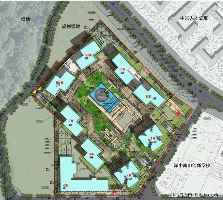 根据学区划分,项目目前在深中南山创新学校的招生范围内,学校位于项目的东南侧,深中南山创新学校 为九年一贯制公办学校,设计规模为54个教学班,其中36个小学教学班,18个初中教学班。