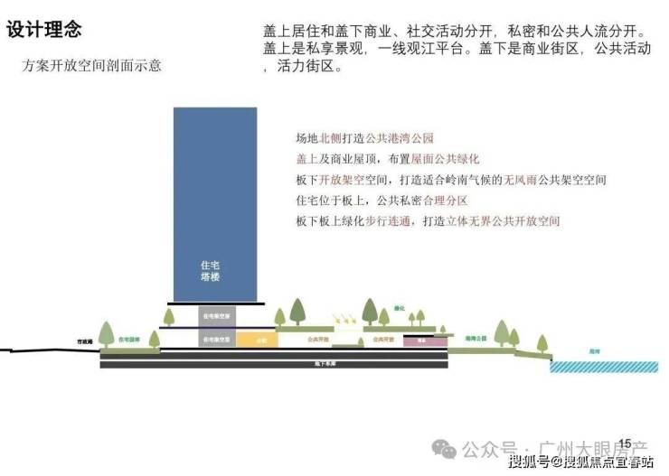 借鉴新加坡设计理念,打造罕有滨水共融综合体,项目采用抬高式盖板创新设计,连接盖上住宅、架空园林、盖下滨水商业及亲水港湾步道,打造广州罕有滨水共融综合体,犹如珠江新城的广粤天地一般。