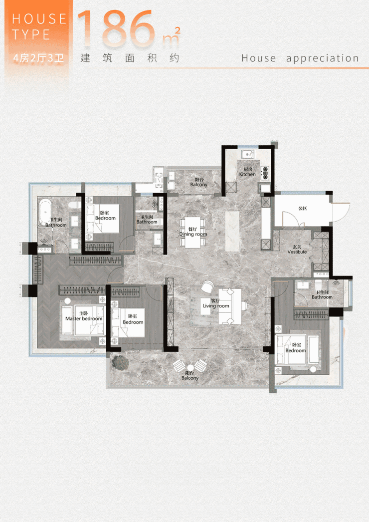 建面约105平户型,餐厅的宽度升级到了约4.3米,客厅开间最大可做到约6.1米!整个餐客厅的面积就超30平,媲美市面上约150平+户型的客厅尺寸。