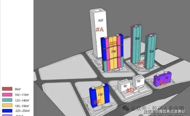 其中A、D地块为写字楼,剩下的B、C、E、F地块主推的是公寓产品,将首推C地块的C2栋,35层高,3梯6户设计。
