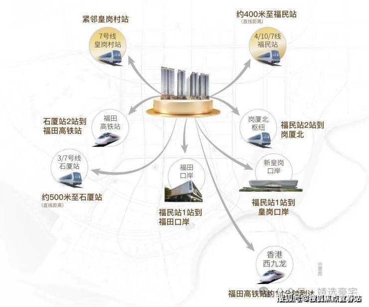 ◎立体交通 畅行湾区 ·1站双口岸 ·2站福田高铁站 ·2站岗厦北枢纽 ·双地铁口 四地铁线 速抵大湾区全域,从容往来深港双城,畅享高效人生。