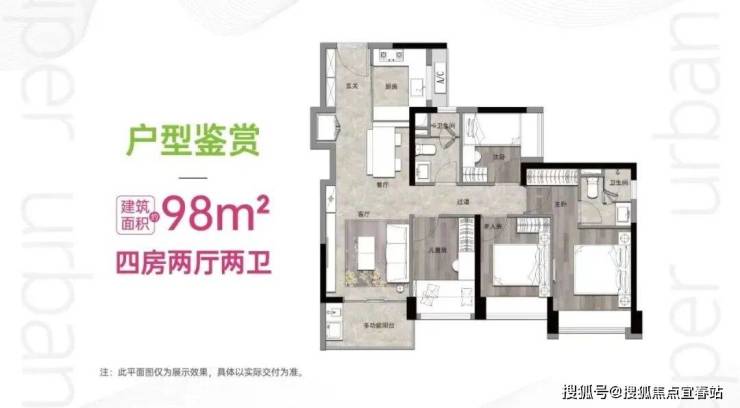 建面98平米:4房2厅2卫,传统的竖厅户型,动静分区,与80平米的普通户型非常相似,仅仅是多了一个房间。均是西南朝向,17栋看的是项目的内部道路和对面的小区,18栋看的是小区花园。