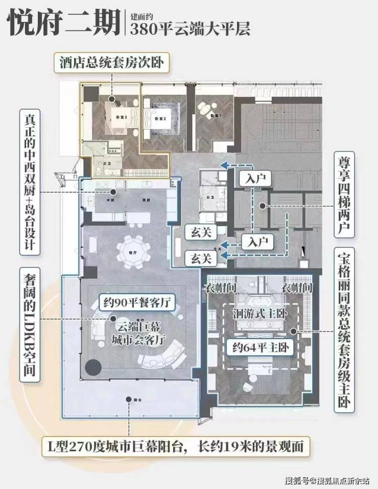 走进大堂,会误以为来到了豪华五星酒店。悦府二期按照全球顶级奢华酒店标准打造的入户大堂,首层约12米的层高和近260㎡的入户大堂,空间奢阔大气,墙面和地面均采用奢石,深藏不露的奢华,带来了与众不同归家仪式感。