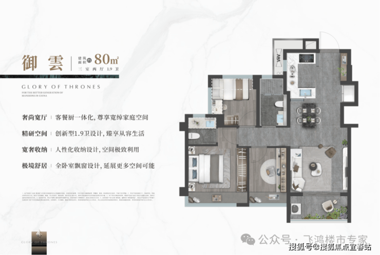 约80平方米三房:创新性的1.9卫设计,巧妙解决了早上高峰期卫生间不够用的尴尬。LDKB一体化设计让客厅、餐厅、厨房与阳台形成有机整体,空间感远超实际面积。3.4米客厅开间,搭配全卧房带飘窗,使得有限面积内拥有了无限的生活可能。