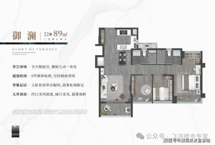 约89平方米三房:这款户型拥有约11米四面宽超幕视野,主卧套房配备了独立衣帽间。客厅开间3.5米,采用新版竖厅格局,空间利用率极高。U型全开敞厨房,让烹饪不再是一个人的孤独。