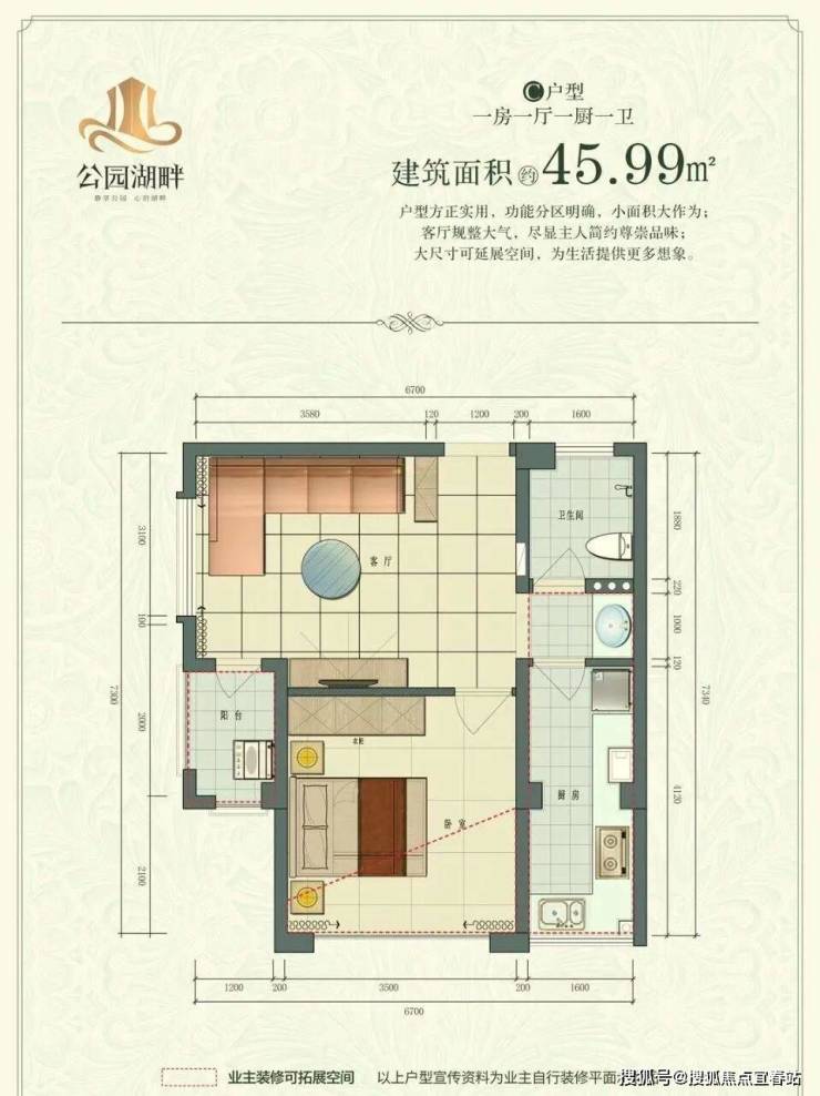 户型:43.1平、45.99平,可拓展12平,正规一房一厅