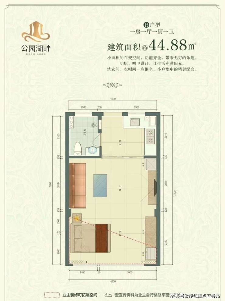 户型 :44.9㎡可拓展8㎡,大开间纯板楼。可扩(一房一厅)