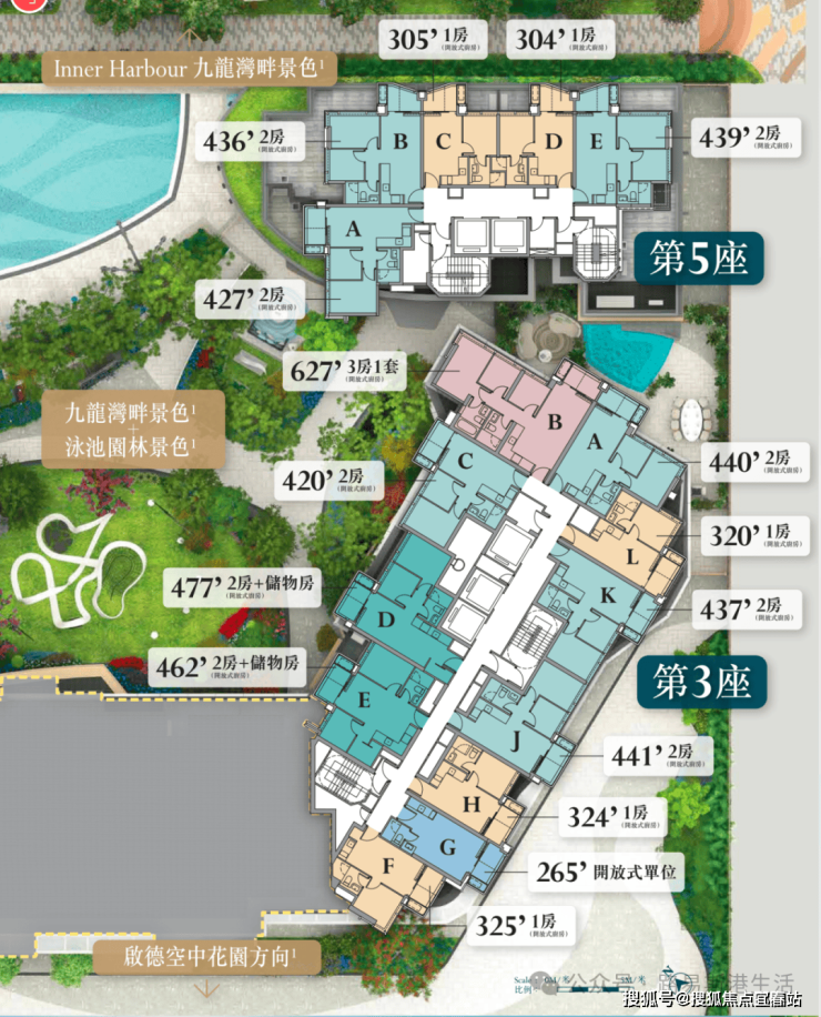 幢数:2幢住宅大厦(第3座及第5座),分别楼高36层(第3座)及7层(第5座)
