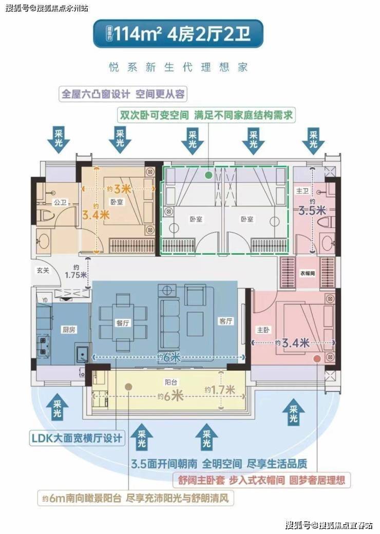 114㎡的4房2厅2卫:传统短进深大开间横厅格局,通透性很好,客厅进深6米,开间4.3米(不含阳台),配有6米宽景阳台,主卧套间设计,配衣帽间和三段式卫生间,这个户型很比较讨喜年轻的购房群体。