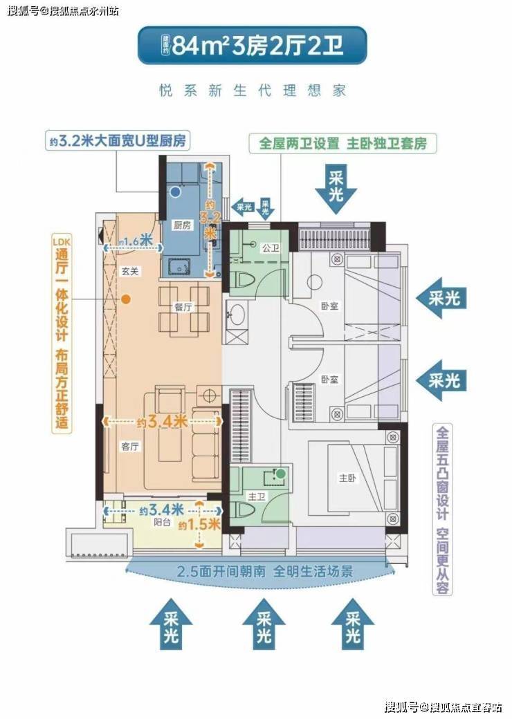 84㎡的3房2厅2卫:传统竖厅动静分区格局,客厅进深7.55米(不含阳台),开间3.4米,主卧8.4㎡(不含主卫和飘窗),空间确实会偏紧凑一点,但没什么硬伤,实用性还是非常不错的。
