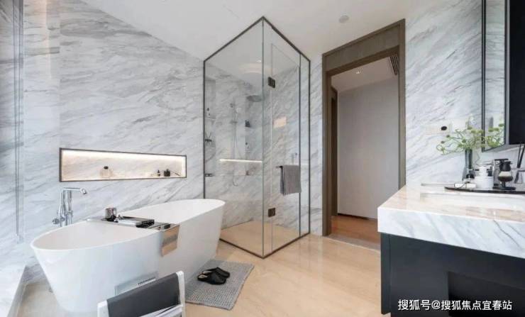 尺度奢阔的卫生间,配备了双台盆与观景浴缸